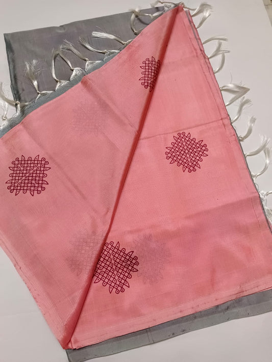 Brand new design vegan silk saree without blouse : GREY BODY WITH MAROON PRINTED KOLAM BUTTA AND SALMON PINK PALLU
