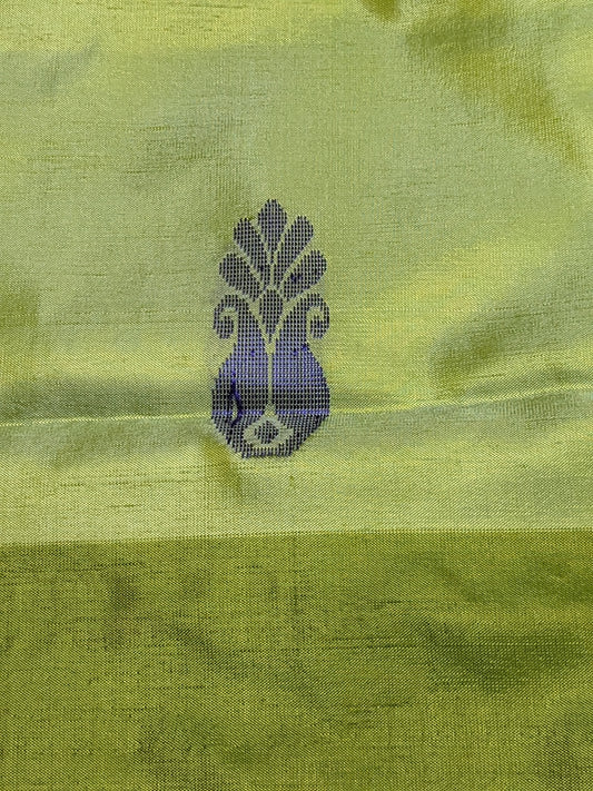 Brand new design vegan silk saree without blouse : METALIC SKYBLUE BODY WITH GREEN PRINTED KOLAM BUTTA AND METALIC GREY PALLU
