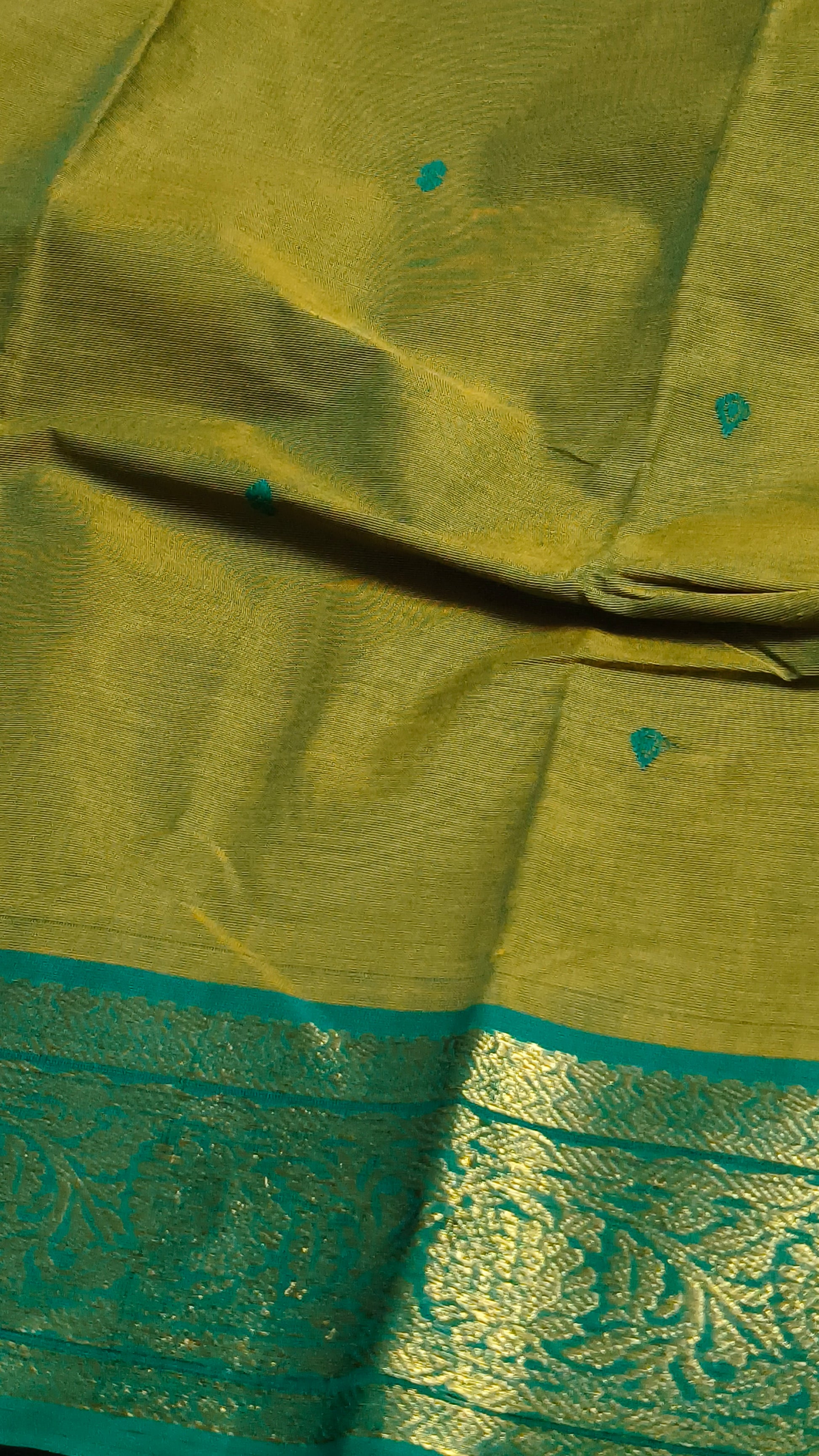 Beautiful green and mustard double shade saree with green coloured border with floral vine design in golden zari .Cute little hearts and tilak thread -green buttas all throughout the body.Saree without blouse, trendy and elegant for all season